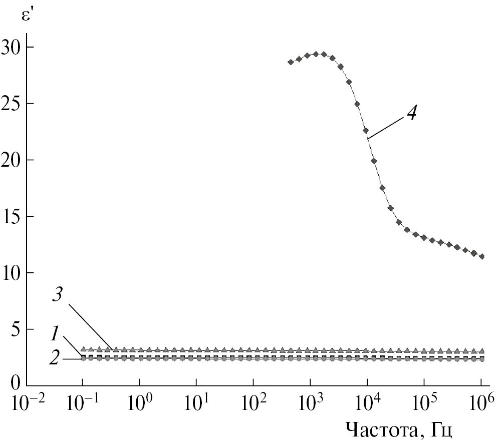Рис. 1. Зависимость диэлектрической проницаемости ∑2 композиций от частоты f при концентрациях НПГ 0.1 (1), 0.25 (2), 1 (3) и 5 мас. % (4).