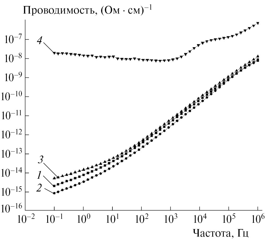 Рис. 2. Зависимость проводимости σac композиций от частоты f при концентрациях НПГ 0.1 (1), 0.25 (2), 1 (3) и 5 мас. % (4).