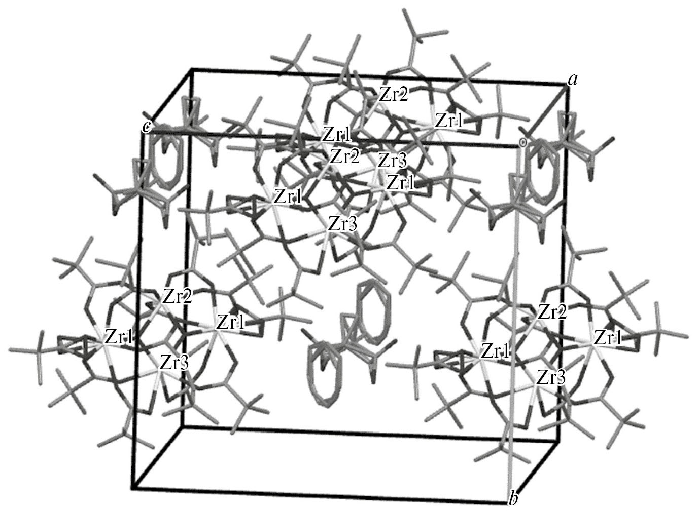 Соединение 1 кристаллизуется в моноклинной сингонии. Кристаллическая структура уточнена в нестандартной пространственной группе I2. На рис. 1 представлена асимметричная часть молекулярной структуры соединения 1. Асимметричная часть включает три атома Zr, шесть пивалатных лигандов, μ3-мостиковый атом кислорода (μ3-O), а также разупорядоченную кристаллизационную молекулу пивалевой кислоты с заселенностью 50% и разупорядоченную молекулу бензола с заселенностью 50%.