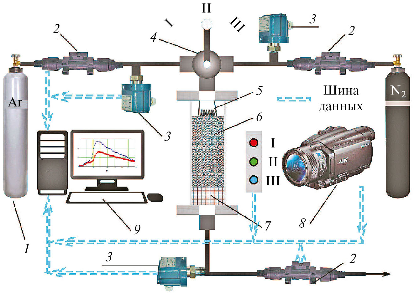 Рис. 1. Схема экспериментальной установки: 1 – баллон с аргоном, 2 – датчики расхода аргона, 3 – датчики давления газа, 4 – переключатель газа (I – азот, II – аргона, III – подача перекрыта), 5 – вольфрамовая спираль, 6 – шихта, 7 – подложка, 8 – цифровая видеокамера, 9 – персональный компьютер для записи данных с датчиков и видеокамеры.