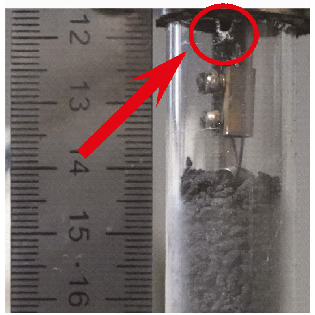 Отдельные эксперименты проводили во встречном потоке ПГ (по ходу изложения такие эксперименты будут дополнительно отмечены). Чтобы реализовать встречный поток ПГ (фильтрация газа осуществляется навстречу распространению фронта горения) в нижнем торце установки выход газа был заблокирован сплошной прокладкой. Для свободного выхода ПГ в верхней части кварцевой трубки были сделаны три пропила длинной 2–3 мм (рис. 2). Отметим, что такую методику эксперимента использовали только для гранулированных смесей.