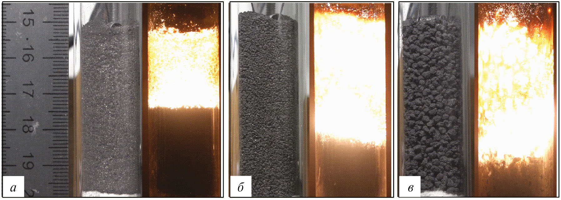 Рис. 3. Внешний вид исходной смеси и кадры горения: порошковой (а) и гранулированных смесей двух фракций: 0.4–0.8 (б) и 1.4–2 мм (в).