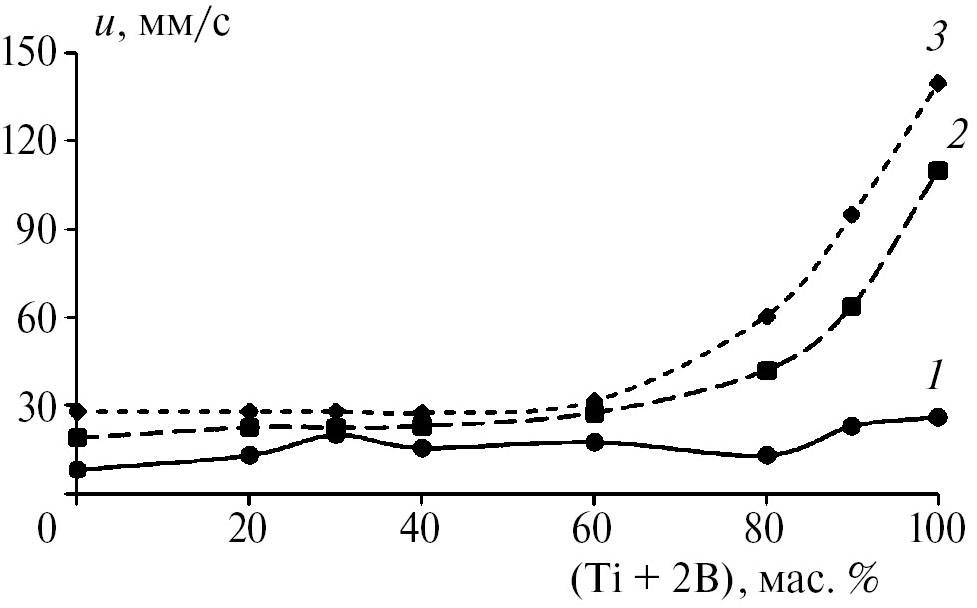 Экспериментально установлено, что зависимость скорости горения порошковой смеси от содержания Ti + 2B имеет немонотонный характер, что связано с влиянием примесного газовыделения.