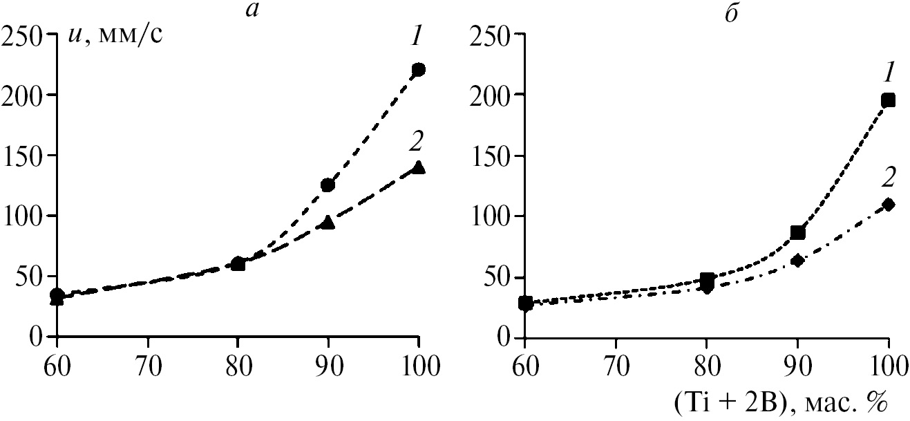 Рис. 5. Зависимости скорости горения гранулированных смесей при изменении состава от 60(Ti + 2B) до (Ti + 2B) в отсутствие ПВБ (1) и с добавкой ПВБ (2); а – крупные гранулы (1.4–2 мм), б – мелкие гранулы (0.4–0.8 мм).