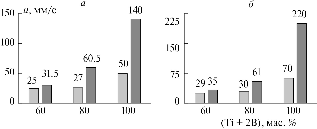 Рис. 6. Значения скоростей горения крупных гранул размером 1.4–2 мм при содержании (Ti + 2B) ≥ 60 мас. %: с ПВБ (а) и без ПВБ (б); при спутной (черные столбики) и встречной (серые) фильтрации примесного газа.