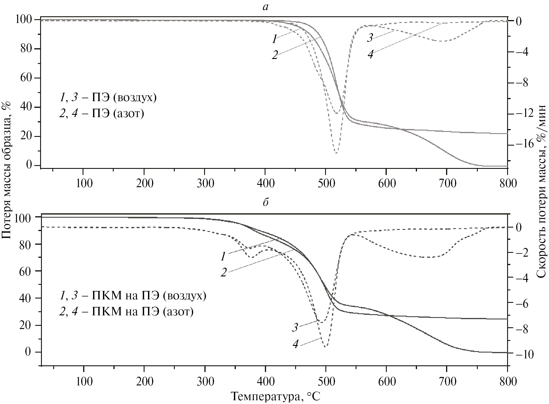 Рис. 1. Результаты ТГА (сплошные кривые) и ДТГ (штриховые) в воздухе и в азоте для образцов ПЭ (а) и ПКМ ПЭ (б).