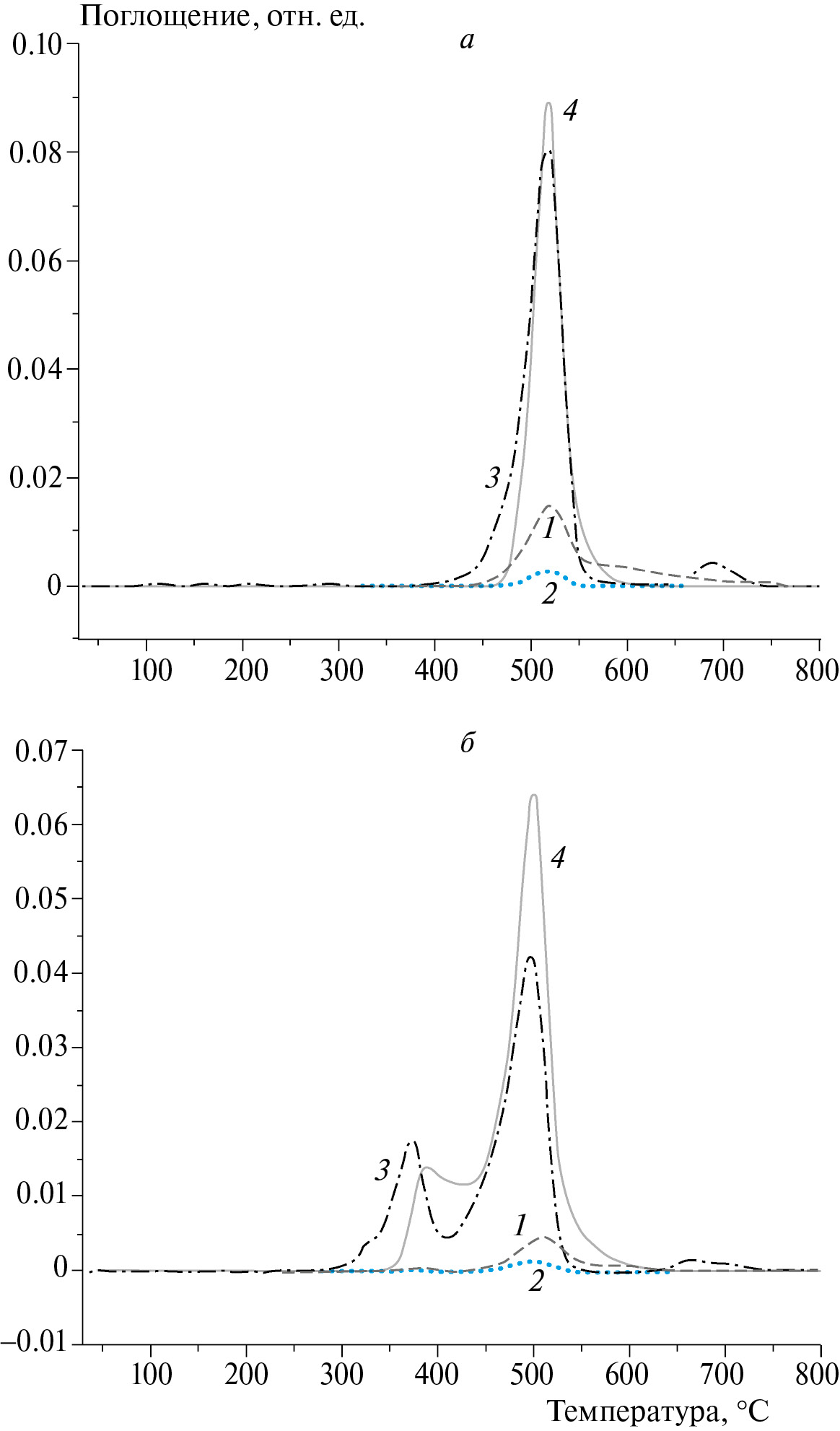 Рис. 3. Результаты ИК-фурье-спектрометрии при термическом разложении в инертной среде (азоте) для образцов: ПК (а) и ПКМ ПК (б). Обозначения: 1 – CH4, 2 – CO, 3 – CO2, 4 – фенолы.