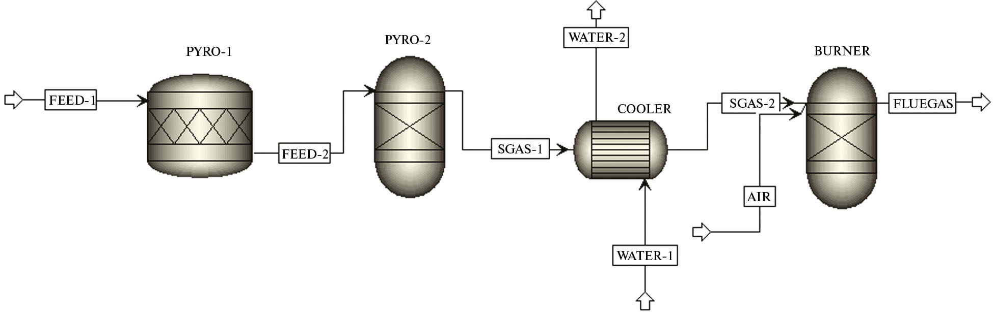 Для моделирования процесса пиролиза разработана схема в программе Aspen Plus, включающая в себя три элемента: реактор пиролиза (две стадии), охладитель пиролизного газа и камеру дожигания (табл. 2). На рис. 4 представлена расчетная модель пиролиза ПКМ в программе Aspen Plus.