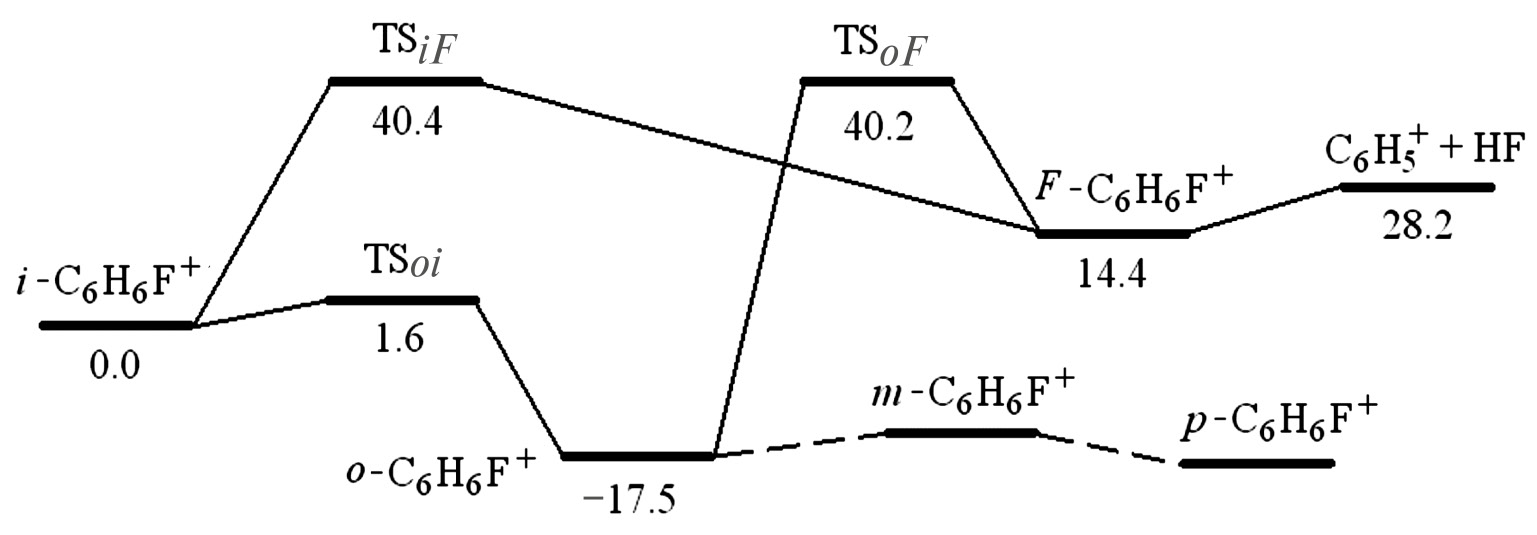 Так как вместе с ипсо-фторциклогексадиенилом в матрице присутствуют продукты его диссоциации (фенил-радикал и фторбензол) [10], то можно считать, что их появление не является следствием изомеризации i-C₆H₆ F. Соответственно, ее можно считать маловероятной и в условиях газофазных экспериментов [2, 8, 13, 15, 16]. Тогда можно предположить, что фторбензол образуется в результате рекомбинации радикалов C₆H₆ F и C₆H₅: