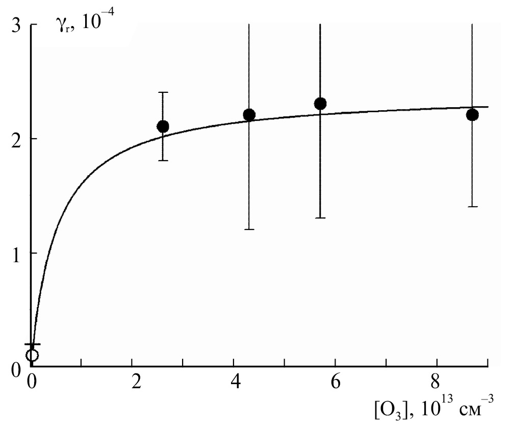 С точки зрения установления механизма захвата, данные при этой концентрации имеют принципиальное значение, но этот диапазон концентрации лежит за пределом нашей абсолютной чувствительности. Форма зависимости амплитудной величины γr от концентрации озона на рис. 3 соответствует механизму захвата через реакцию адсорбированной молекулы на поверхности: величина γr обратно пропорциональна [O₃] при больших значениях [O₃] и практически не зависит от [O₃] при малой концентрации озона. В соответствии с ленгмюровским представлением захват происходит по схеме [49]