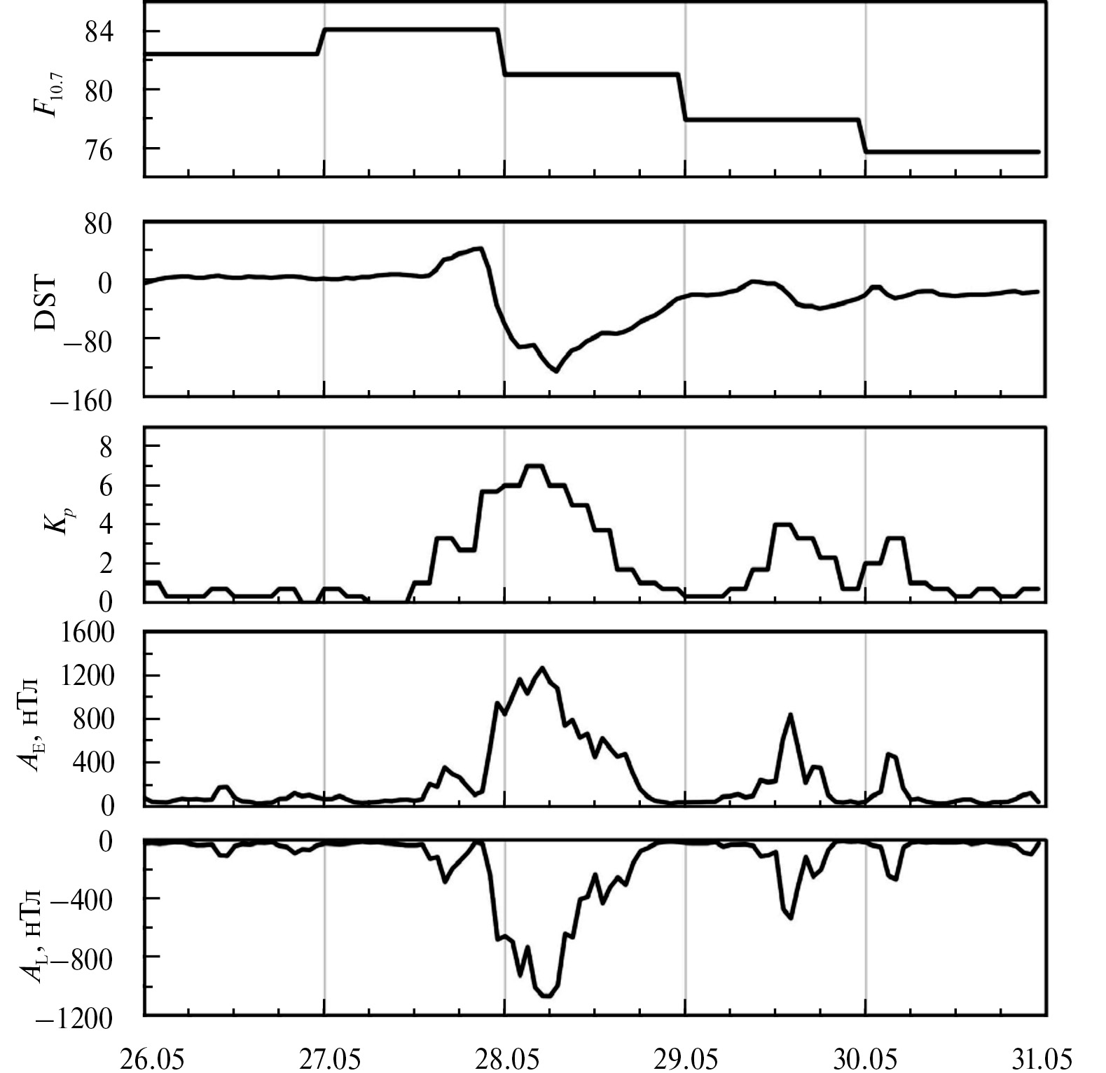 Рис. 5. Вариации индексов геомагнитной и солнечной активности с 26 по 30 мая 2017 г. F₁₀₇– в с.е.п., 1 с.е.п. = 10⁻²² Вт/(м² · Гц).
