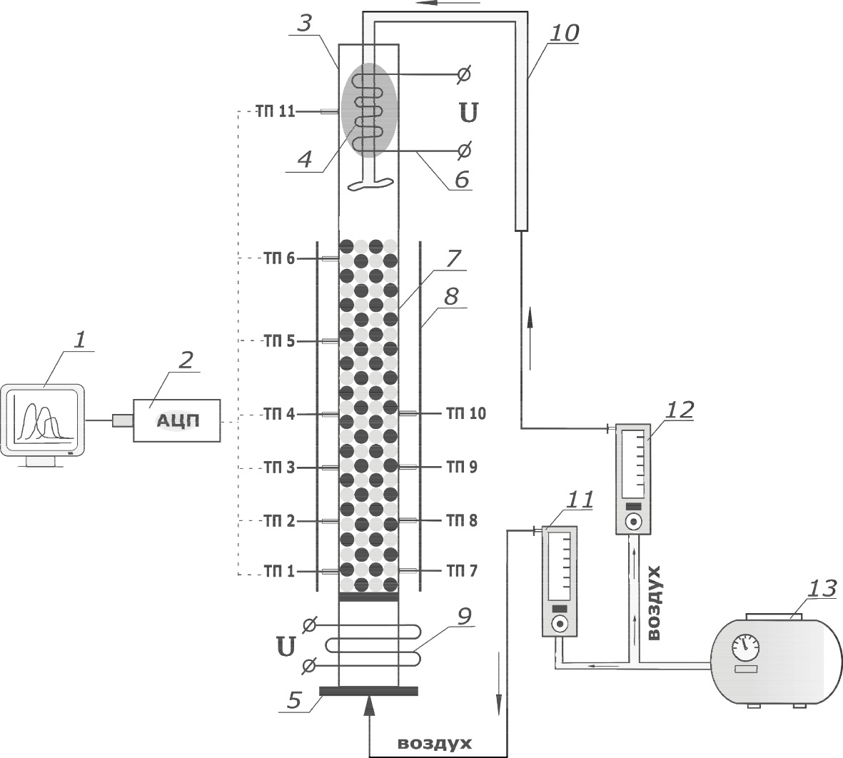 Рис. 1. Принципиальная схема экспериментальной установки: 1 – компьютер для регистрации показаний температуры; 2 – АЦП; 3 – дожигатель продуктов газификации; 4 – горючие продукты газификации; 5 – нижний фланец; 6 – электроспираль воспламенения продуктов газа; 7 – реактор; 8 – теплоотражающий экран; 9 – инициатор с нагревающей спиралью; 10 – воздуховод дожигателя; 11, 12 – расходомеры; 13 – компрессор для подачи воздуха.; ТП 1–ТП 11 – термопары.