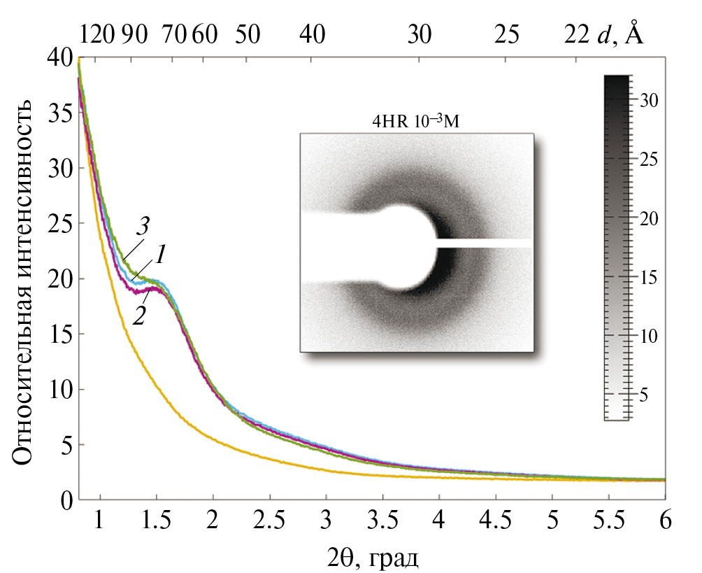 На рис. 1а показаны кривые рассеяния синхротронного излучения клетками, подвергнутыми воздействию 4HR в концентрациях 10–4 М (кривая 1) и 10–3 М (кривая 2), а на рис. 1б – кривые рассеяния синхротронного излучения для клеток, подвергнутых воздействию 4HR в концентрации 10–4 М (кривая 1), 10–5 М (кривая 2) и 10–6 М (кривая 3).