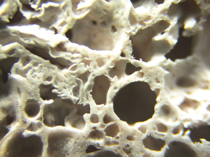 В результате синтеза частиц гидроксиапатита по реакции (1) в суспензии природного полимера – коллагена [9, 10] – и удаления жидкости из композита под действием микроволнового излучения в СВЧ-печи были изготовлены пористые органоминеральные композиты для замещения дефектов костной ткани (рис. 1) [16, 17].