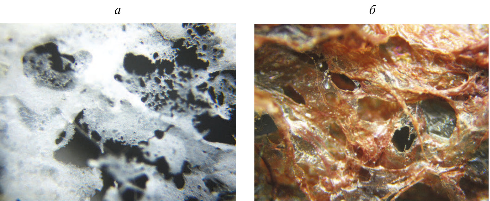 Рис. 2. Микрофотографии образцов, образовавшихся на водной поверхности в результате СВЧ-нагрева суспензий: а – образец из волокон ПГБ, б – образец из волокон ПГБ, допированных красителем (тетрафенилпорфирином).