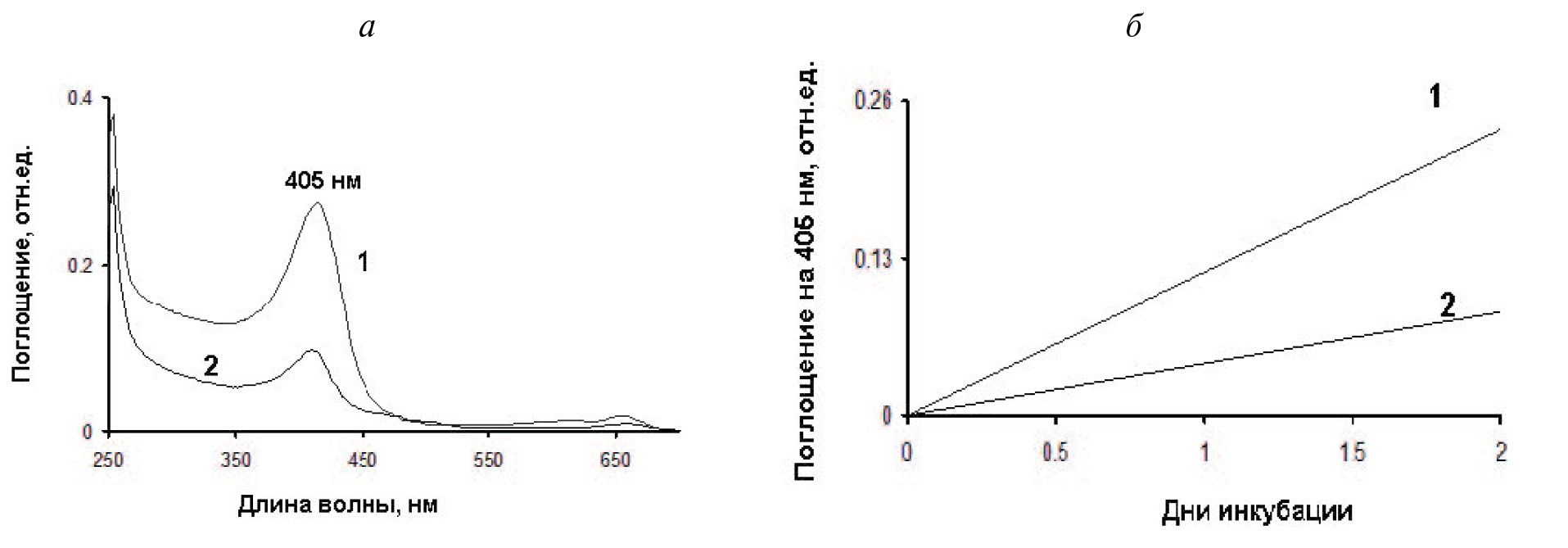 Рис. 3. а – Спектры поглощения хлорина на второй день инкубации образцов полимерных композитов; б – зависимость выхода хлорина из образцов композитов от времени инкубации в буферном растворе при температуре 37 °C; 1 – образец ПКЛ + ПВП + хлорин, 2 – образец ПЛА + ПВП + хлорин.