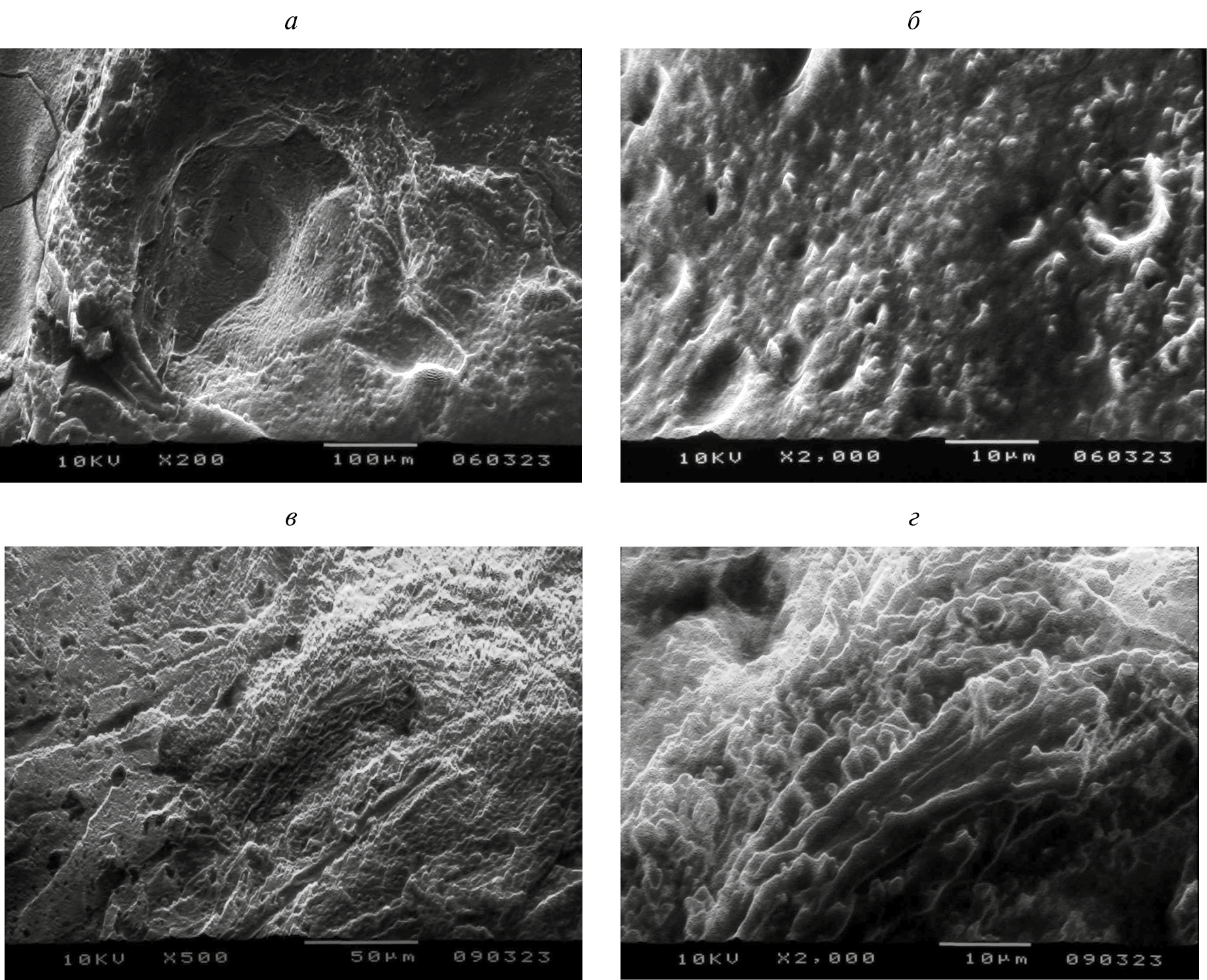 Рис. 5. Электронные микрофотографии образцов исходного сополимера Ф-62 (а, б) и его композита с магнитными частицами (в, г) после СВЧ-обработки.