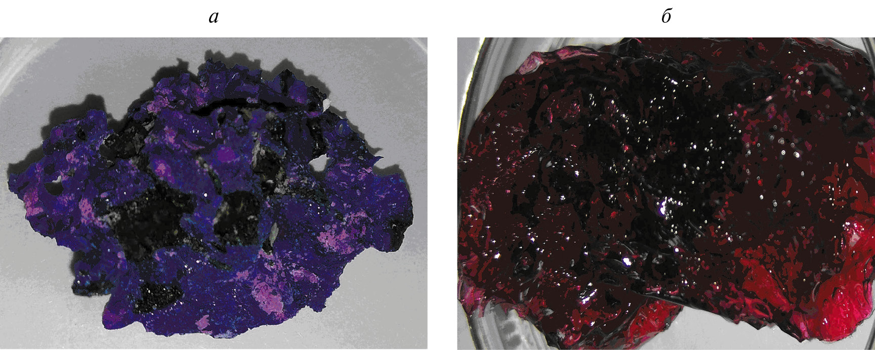 На рис. 6 представлены фотографии образцов после набухания полученного полимерного композита в растворе хлорида кобальта (II) (рис. 6а) и его последующего взаимодействия с боргидридом натрия (рис. 6б). Восстановленный образец обладал ферромагнитными свойствами, что позволяет использовать полученные композиты в экологических целях для эффективной сорбции и последующей магнитоуправляемой транспортировки загрязнителей водной среды [30–33].