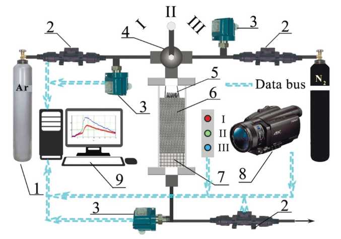 Исследование закономерностей горения гранулированных смесей осуществляли на экспериментальной лабораторной установке, схема которой представлена на рис. 1 [16]. Гранулированную смесь засыпали в кварцевую трубку, в один конец которой предварительно была вставлена металлическая сетка со слоем минеральной ваты (Al2O3) толщиной 2–3 мм. Далее ее закрепляли между двух уплотнительных элементов из термостойкой резины, что позволяло избежать влияния окружающей среды на процесс горения. Перед каждым экспериментом образцы продували потоком аргона при перепаде давления 1 атм, что позволяет избежать усадки в процессе горения. Зажигание осуществляли с верхнего торца образца, пропуская электрический ток через вольфрамовую спираль.