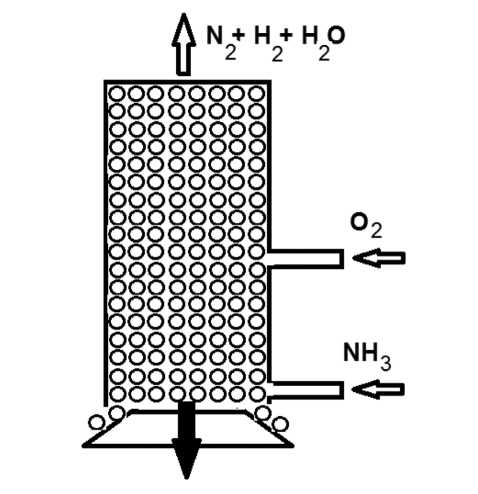 Продукты пиролиза аммиака поступают в центр реактора, где, смешиваясь с окислителем, часть водорода сгорает с выделением тепла для поддержания процесса пиролиза:
