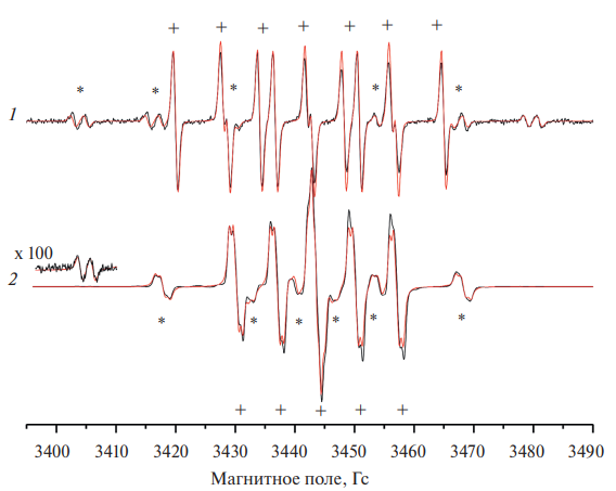 Рис. 1. Экспериментальные (черные линии) и теоретические (красные линии) спектры ЭПР аддуктов PBN (спектр 1) и DMPO (спектр 2) после 4-минутного фотолиза (λ = 365 нм) раствора дихлорметана CH2Cl2 при 290 K.