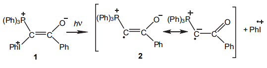 В последние годы смешанные фосфониево-иодониевые илиды (Y) привлекают значительное внимание в качестве реагентов для синтеза новых гетероциклических соединений, которые находят все большее применение как функциональные материалы в органической электронике и в тест-системах для анализа биологических систем [1–4]. Особенно интересными с практической точки зрения являются реакции фотораспада Y и их взаимодействие с ацетиленами, которые происходят в дихлорметане. Первоначально предполагалось, что реакции фотораспада Y протекают по ионному механизму, и гетероциклы разных классов получаются из одного и того же промежуточного карбокатиона, который образуется в результате отщепления PhI+ при фотолизе [5]. Однако недавно была установлена возможность радикального распада илидов [6–8] и предложен возможный механизм гомолитического распада для смешанного бензоильного илида 1 (Cхема 1), аналогичный распаду диарилиодониевых солей. Образующиеся радикальные продукты могут реагировать как с растворителем, так и с добавленными ацетиленами.