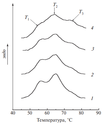 Рис. 2. ДСК-Термограммы денатурации контрольного образца плазминогена (1) и образцов, обработанных гипохлоритом натрия в разных концентрациях: 62.5 мкМ (2), 125 мкМ (3), 250 мкМ (4), 50 мМ фосфатный буфер, рН 7.4, 150 мМ NaCl, концентрация плазминогена – 3 мг/мл; T1, T2, T3 – температуры денатурации переходов.