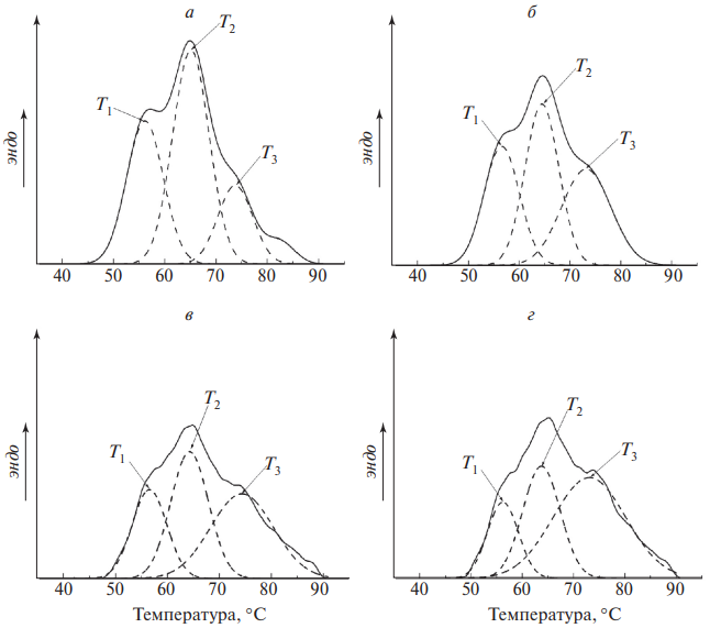 Рис. 3. Деконволюция ДСК-термограмм денатурации контрольного образца плазминогена (а) и образцов, обработанных гипохлоритом натрия в разных концентрациях: 62.5 мкМ (б), 125 мкМ (в); 250 мкМ (г) на 1 мг белка; 50 мМ фосфатный буфер, рН 7.4, 150 мМ NaCl, концентрация плазминогена – 3 мг/мл. Сплошные линии – экспериментальная ДСК-термограмма, штриховые – результат деконволюции ДСК-термограмм, где Т1, Т2 и Т3 соответствуют температурным переходам.