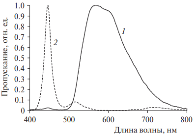 Рис. 1. Спектры используемых светильников: желтый (1) и синий (2) с максимумами при λmax = 560 и синий – λmax = 450 нм соответственно.