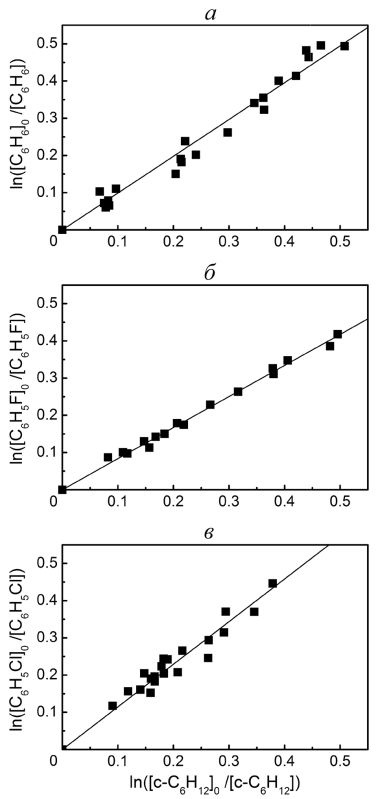 Для определения констант скорости реакций применялся метод конкурирующих реакций. В качестве конкурирующей реакции была выбрана реакция атомов фтора с циклогексаном. По измеренным зависимостям глубин превращения бензола, фторбензола и хлорбензола от глубины превращения циклогексана были определены отношения констант скорости исследуемых и конкурирующей реакций. Константа скорости конкурирующей реакции