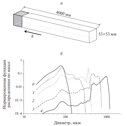 Рис. 1. а – Схематическое изображение расчетной области – вертикального канала с вектором ускорения силы тяжести, направленным сверху вниз; б – массовое распределение капель изооктана по размерам: кривая 0 – эксперимент, кривые 1– 4 – расчет по модели коагуляции капель для разных сечений канала, цифры 1–4 соответствуют расстоянию от начала канала в метрах.