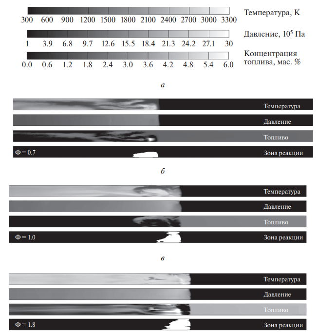 На рис. 3 показаны мгновенные расчетные распределения массовой доли паров горючего, температуры и давления, а также условная зона реакции в установившейся детонационной волне, бегущей по обедненной горючим (Ф = 0.7, рис. 3а), стехиометрической (Ф = 1, рис. 3б) и обогащенной горючим (Ф = 1.8, рис. 3в) двухфазным смесям. Условная зона реакции и детонационной волны – это зона, внутри которой разность скоростей детонации и спутного потока меньше местной скорости звука, а на краях выполняется условие ЧЖ. Минимальный продольный размер зоны реакции достигается в детонационной волне, бегущей по смеси, обогащенной горючим, что хорошо согласуется с теорией [12]. Такая волна распространяется благодаря быстрому самовоспламенению и выгоранию ударно-сжатой смеси предварительно испаренного горючего с воздухом почти равномерно по всему поперечному сечению канала: массовая доля паров горючего за фронтом детонационной волны быстро уменьшается практически до нуля, приводя к выполнению условия ЧЖ. В работе [12] такой механизм распространения гетерогенной детонации назван кинетическим. Далее оставшееся в жидкой фазе горючее испаряется в продуктах детонации и относительно медленно догорает в диффузионном режиме при смешении с оставшимся воздухом, приводя к некоторому повышению температуры. Как и следовало ожидать, в продуктах реакции остается много непрореагировавшего горючего.