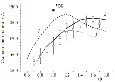 Рис. 4. Сравнение расчетных (кривые) и измеренной (квадраты) зависимостей скорости детонации в двухфазной изооктано-воздушной смеси от суммарного коэффициента избытка горючего. Расчеты проведены для условий, полученных путем продувки канала изначально монодисперсными двухфазными смесями с каплями диаметром 150 (кривая 1) и 400 мкм (кривая 2) и для условий с начальной полидисперсной двухфазной смесью, учитывающей коагуляцию капель при продувке канала (кривая 3). Черная точка соответствует термодинамической скорости детонации ЧЖ.