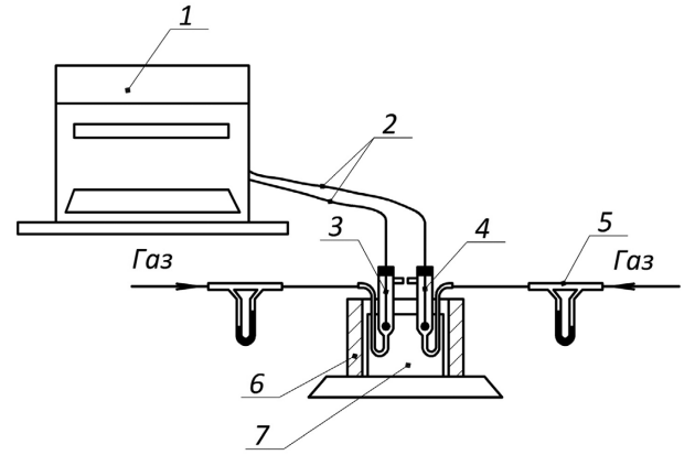 Опыты воспроизводящие процесс окислительного обжига проводили на установке (рис. 1), включающей пирометр 1 Курнакова ФПК-59, обжиговую печь сопротивления 6, блок 7 с двумя углублениями, в одно из них помещали сосуд 4 с исследуемым необожженным образцом, в другое – сосуд 3 с обожженным образцом, выполняющим роль инертного вещества. Оба образца шаровидной формы имели одинаковый диаметр, равный 10 мм. С целью равномерного распределения потока газа по сечению сосудов 3 и 4, его пропускали вначале через засыпку из кварцевого песка, после чего газ “омывал” исследуемые образцы. Таким образом, оба образца при проведении опыта находились в одинаковых тепловых условиях. Расход газа контролировали реометром 5 и поддерживали в пределах 10-4 м3/с. Скорость фильтрации газа при этом составляла 0.4–0.5 м/с. Замеры температуры осуществляли платинородий-платиновыми термопарами 2. Продолжительность опыта составляла 110 мин. Образцы нагревали вместе с печью в потоке газа с различным содержанием кислорода: 0; 11; 21; 100%; скорость нагрева образцов – 10 °С в минуту; анализ проб газа O2, CO2, N2 осуществляли с помощью хроматографа типа ХПА-4.