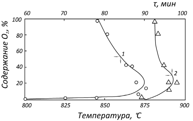 Рис. 2. Влияние состава газовой фазы на температуру (1) и промежуток времени (2), в течение которого наступает максимальная интенсивность процесса декарбонизации. Стрелки указывают на зависимость содержания кислорода от продолжительности термообработки и температуры.
