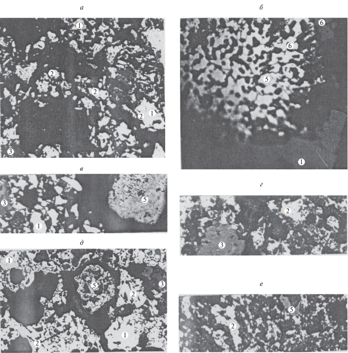 Рис. 5. Микроструктура офлюсованных образцов, обожженных в потоке воздуха при температуре 900 °C с выдержкой 10 мин (а), 1000 °C с выдержкой 2 мин (б), 1000 °C с выдержкой 3 мин (в), 1000 °C с выдержкой 10 мин (г, д) и 19 мин (е): 1 – магнетит; 2 – гематит; 3 – исходные нерудные минералы; 4 – шлаковая масса; 5 – ферриты кальция; 6 – пирит. Съемка в отраженном свете с увеличением микроскопа 150х (а, в, г, д); 700х с масляной иммерсией (б).