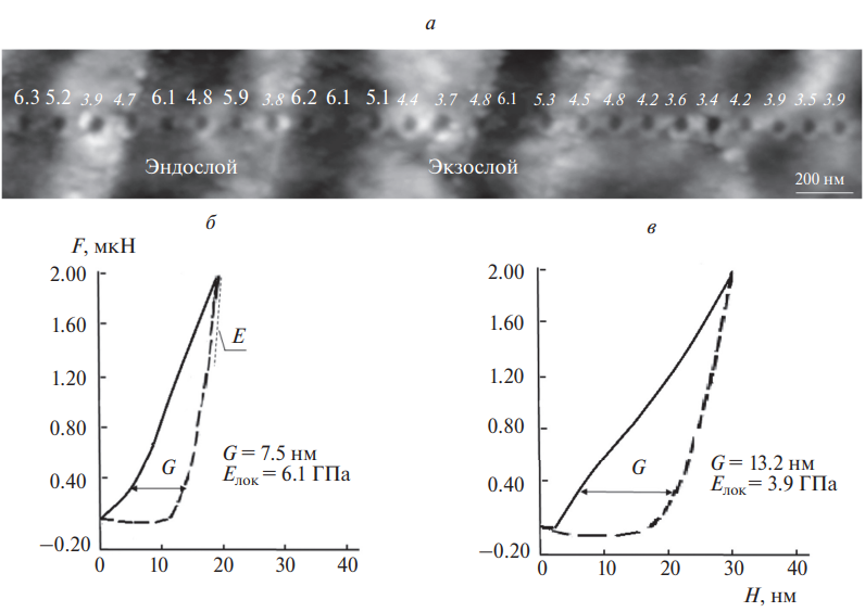 Рис. 6. а – Топографическое изображение кутикулы, показывающее следы индентов и показатели значений локального модуля Юнга для эндо- и экзослоя; б, в – характерные силовые кривые для эндо- (б) и экзослоя (в).
