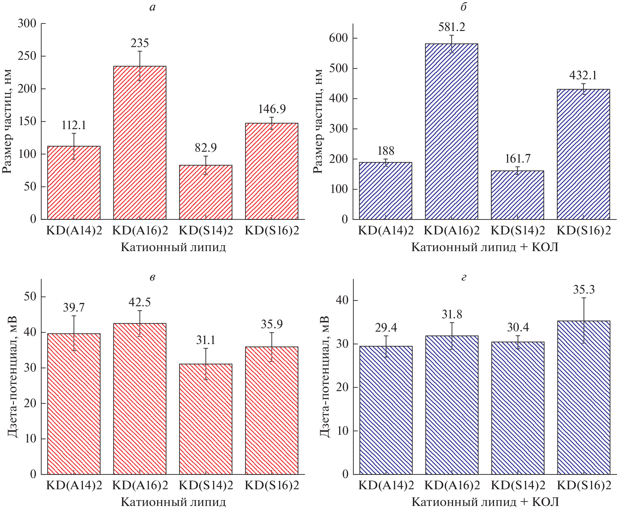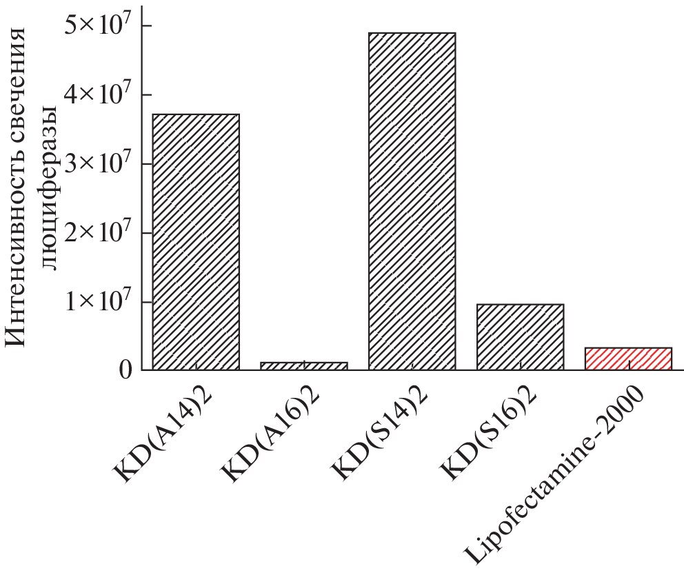 Данная работа направлена на получение смешанных липосом на основе природных аминокислот как средств доставки противоопухолевых препаратов и нуклеиновых кислот. Липосомы сформированы из катионных липидов на основе L-аланина и L-серина, керасомообразующего липида на основе L-орнитина, а также фосфолипидов (фосфатидилхолина (PC) или 1,2-ди-О-олеоилфосфатидилэтаноламина (DOPE)). Для разработанных транспортных систем определены размер частиц, дзета-потенциал, стабильность и изучена биологическая активность на линиях клеток MCF-7 и HEK 293. Липосомы на основе L-серина демонстрируют способность аккумулироваться в эндоплазматическом ретикулуме клеток в течение 1 ч, а также трансфекционную активность, значительно превышающую активность коммерческого препарата Lipofectamine-2000. Предложенная система обладает небольшим токсическим эффектом (IC50 составляет 0.475 мг/мл, а безопасная рабочая концентрация – 0.24 мг/мл).