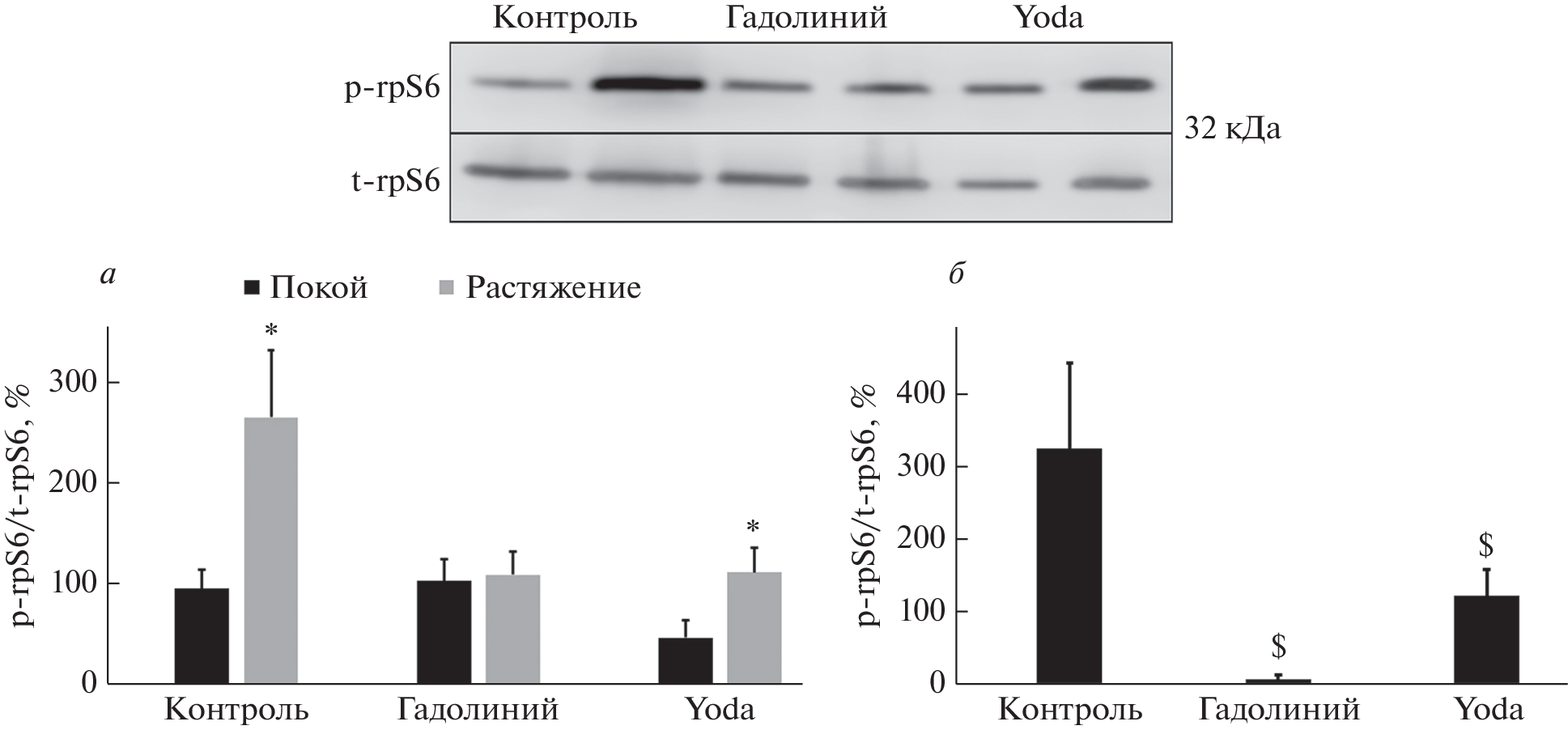 It is known that mTORC1-dependent pathway is involved in the activation of muscle protein synthesis and hypertrophy in response to mechanical stress. However, mechanosensors that mediate sensing and transmission of mechanical signals to the mTORC1 signaling pathway (mechanotransduction) are not yet identified. Mechanically activated (MA) ion channels are viewed as potential candidates for the role of such sarcolemmal mechanosensors. The aim of our work was to investigate the potential role of MA channels (Piezo1) in the activation of the mTORC1 pathway in the isolated rat soleus muscle in response to mechanical stress. Wistar rats were divided into 3 groups: 1) “Control” (isolated muscles were not exposed to MA channel inhibitor or Piezo1 channel activator); 2) “Gadolinium” (muscles were incubated with MA channel inhibitor, gadolinium chloride); 3) “Yoda” (muscles were incubated with Yoda1, Piezo1 activator). In rats from each group, the soleus from the left limb was incubated in the appropriate solution without mechanical stress in the form of a passive stretching, and the soleus from the right limb was subjected to passive stretching and then incubated in the appropriate solution. Phosphorylation of mTORC1 targets (p70S6K, rpS6, 4E-BP1) in rat soleus was determined by PAGE and immunoblotting. After passive stretching of the isolated soleus muscle there was an increase in phosphorylation of p70S6K, its substrate, rpS6, as well as 4E-BP1, by 38.5%, 168%, and 112%, respectively, compared to the soleus muscle that was not subjected to stretching. Incubation of the muscles with gadolinium completely prevented the activation of mTORC1 markers caused by stretching. Incubation of the soleus muscle in the solution with Yoda1 resulted in a decrease in the mechano-dependent phosphorylation of p70S6K, rpS6, and 4E-BP1 compared to a muscle that was not exposed to Yoda1. Thus, Piezo1 channels do not appear to play a role in the activation of mTORC1 signaling in rat soleus muscle in response to passive stretching.