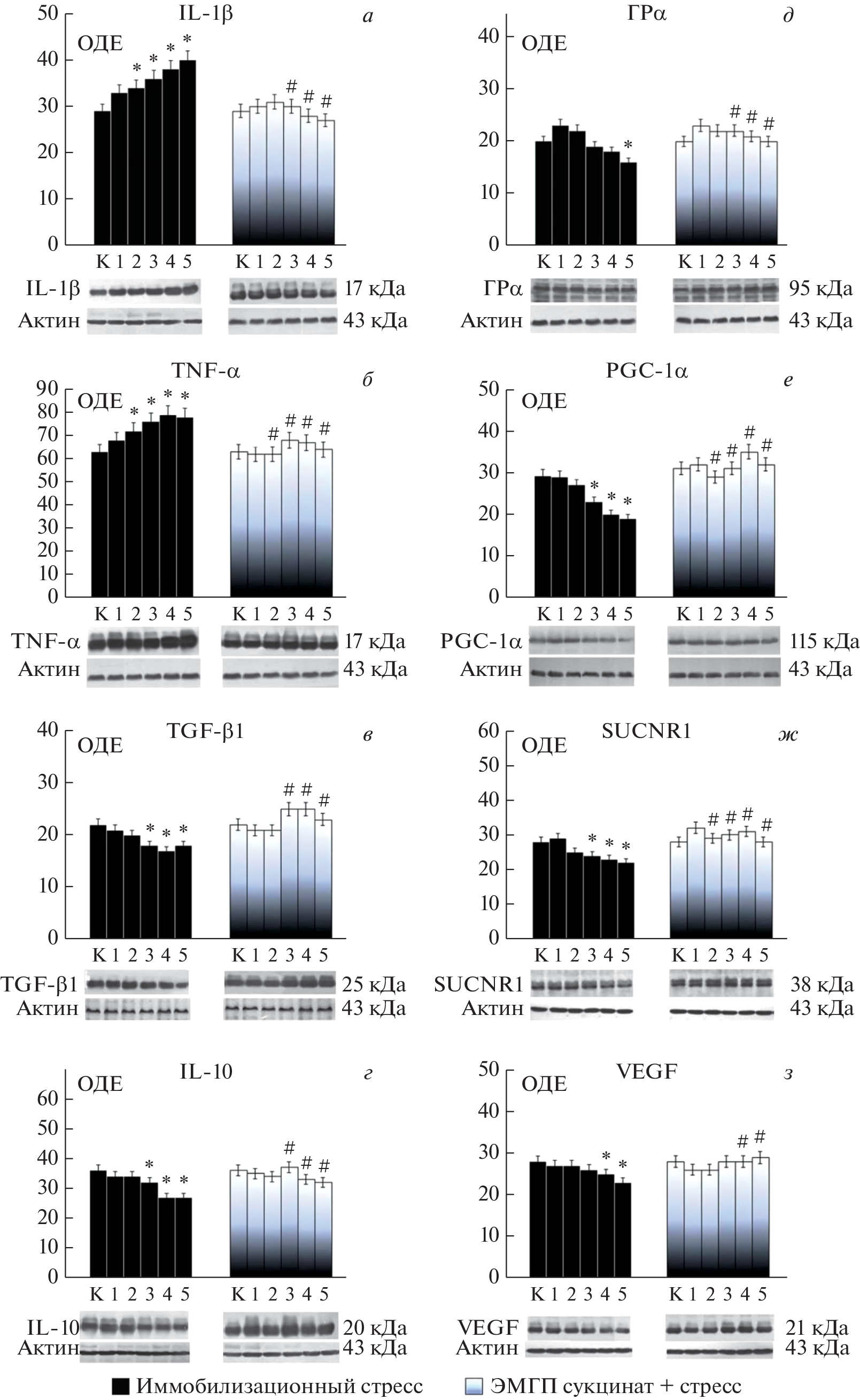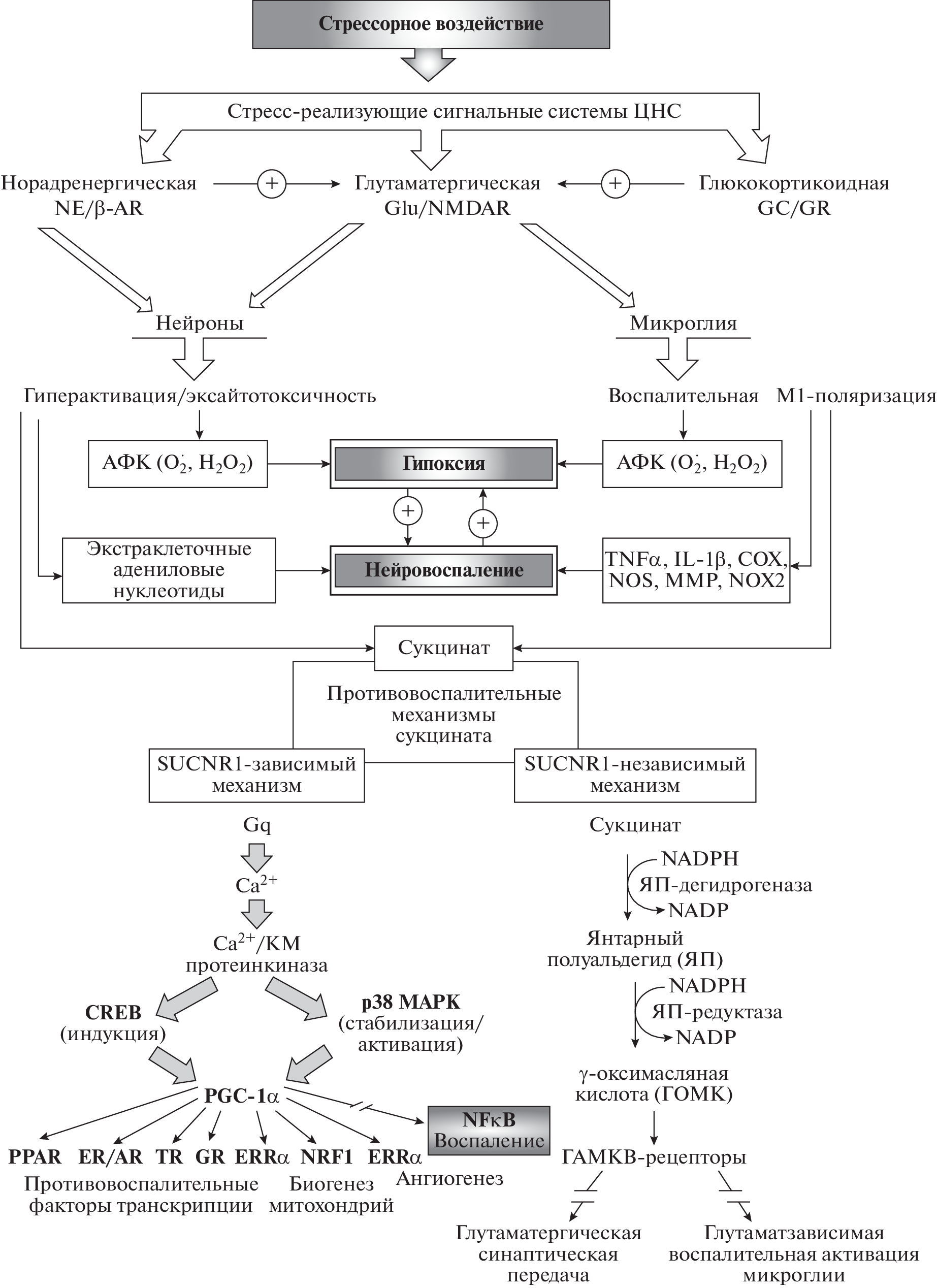 В старении организма и развитии возраст-ассоциированных заболеваний триггерным механизмом признается гиперактивация гипоталамо-гипофизарно-надпочечниковой нейроэндокринной оси, гиперсекреция глюкокортикоидов, оказывающих при чрезмерной и долговременной стимуляции воспалительно-дегенеративные эффекты. Хронический стресс усугубляет глюкокортикоид-зависимые атрофические изменения в стареющем мозге, усиливает нейровоспаление и неврологическую дисфункцию, является ключевым фактором риска болезни Альцгеймера. В коррекции асептического нейровоспаления у лиц пожилого и старческого возраста патогенетически обосновано применение противовоспалительных агентов, проявляющих антиглюкокортикоидные (проанаболические) и антиглутаматные (антиэксайтотоксические) эффекты. Сукцинат/SUCNR1-сигнализация задействована в развитии иммуномодулирующих, трофических, антигипоксических эффектов, однако ее роль в механизмах стресс-реакции остается неисследованной. Цель работы заключалась в оценке влияния сукцинат/SUCNR1-сигнализации на развитие стресс-индуцированного нейровоспаления в коре головного мозга старых крыс. Работа была выполнена на белых беспородных крысах-самцах в возрасте 18 мес. Хронический иммобилизационный стресс моделировали путем 6-часового ограничения подвижности животных в индивидуальных пластиковых пеналах ежедневно на протяжении 5 дней. В качестве формы сукцината, преодолевающей гематоэнцефалический барьер, был использован препарат мексидол (2-этил-6-метил-3-гидроксипиридина (ЭМГП) сукцинат). Мексидол вводили внутрибрюшинно в дозе 100 мг/кг ежедневно на протяжении 5 дней за 15 мин до начала стрессирования. В образцах коры головного мозга (КГМ) методом иммуноблотинга определяли содержание провоспалительных цитокинов (IL-1β, TNF-α), противовоспалительных цитокинов (TGF-β1, IL-10), глюкокортикоидных рецепторов (ГРα), транскрипционного коактиватора PGC-1α, сукцинатного рецептора SUCNR1/GPR91, фактора роста эндотелия сосудов VEGF. Было показано, что хронический иммобилизационный стресс вызывал увеличение уровня IL-1β и TNF-α в курсе стрессирования, что сопровождалось снижением содержания противовоспалительных цитокинов, SUCNR1, ГРα, PGC-1α. Курсовое введение ЭМГП сукцината ограничило развитие стресс-индуцированного нейровоспаления в КГМ старых крыс, предотвратило снижение уровня SUCNR1, IL-10, TGF-β1, PGC-1α, ГРα. Исследование впервые раскрывает стресс-протекторный потенциал сукцинат/SUCNR1-сигналинга в мозге старых крыс, связанный с активацией PGC-1α-зависимых противовоспалительных механизмов в условиях хронического стресса.