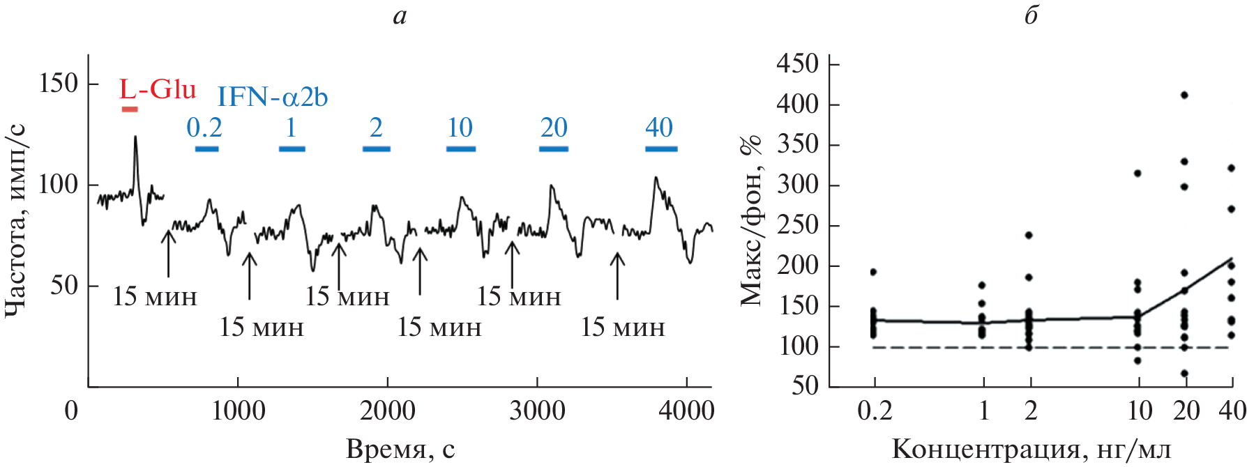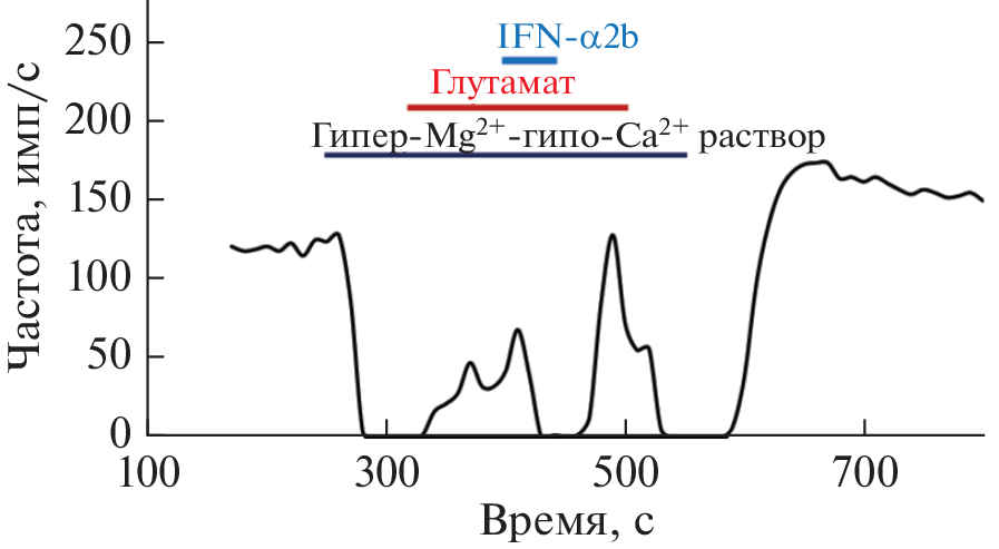 Reportedly, the innate and adaptive immunity molecules can modulate the synaptic activity of the central nervous system. Interferons are widely used in the treatment of oncological and viral diseases. Even though interferons are classified as ototoxic substances, the mechanism of their effect on the synaptic activity of the inner ear remains unexplored. Here, we analyzed modulating influences of interferon α2b (IFN-α2b) on the function of afferent glutamatergic synapse in the conditions of drug application to the synaptic zone. The experiments were performed on the isolated vestibular apparatus of a frog (Rana temporaria) using an electrophysiological method. IFN-α2b (0.2–40 ng/mL) caused an increase in the background pulse activity of afferent fibers, followed by a decrease in the frequency of discharges, usually at high concentrations of the interferon. Besides, IFN-α2b decreased the glutamate (L-Glu) evoked response and modulated the level of afferent fiber activity restored by L-Glu under the conditions of blockade of the glutamate release from hair cells in hyper-Mg2+ and hypo-Ca2+ solution. This suggests the postsynaptic effect of IFN-α2b. The presented data indicate the neuromodulating effect of interferon on the synaptic activity of the afferent synapse of the vestibular apparatus.