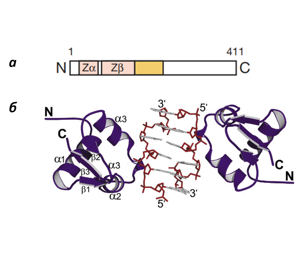 Рис. 6. Схема доменной организации ZBP1 (а) и модель структуры комплекса Z-ДНК c двумя молекулами ZBP1 (б) (адаптировано из [71, 74], используется с разрешения издательства). а — Розовым показаны Zα- и Zβ-домены, связывающие Z-форму ДНК; желтым показан D3-регион, участвующий в связывании правозакрученной В-формы ДНК. б — дцДНК (коричневый цвет), молекулы ZBP1 (фиолетовый цвет).