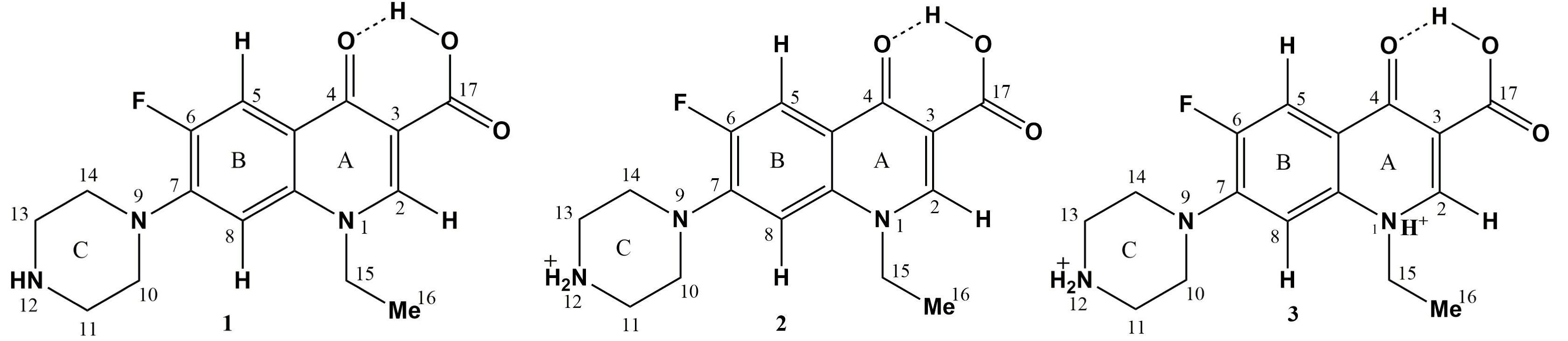 Рис. 1. Структурные формулы норфлоксацина (1) и его солей, моногидрохлорида (2) и дигидрохлорида (3).