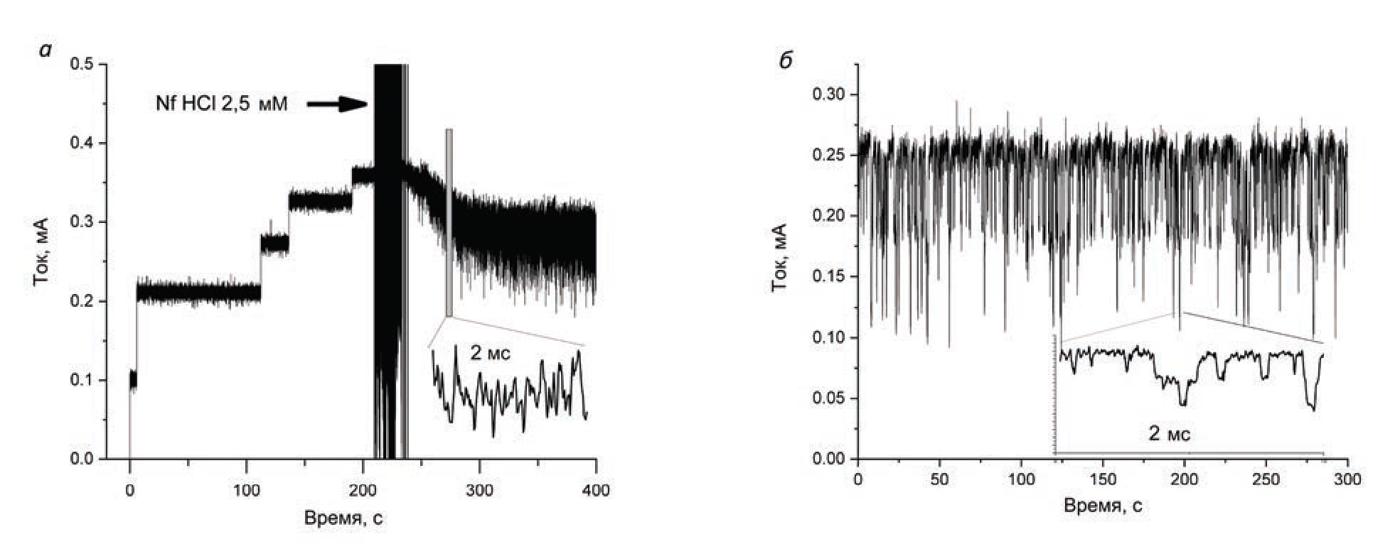Мы проанализировали движение одиночных молекул Nf·HCl (2) и Nf·2HCl (3) через канал YpOmpF. Добавление YpOmpF (200 нг/мл) с cis-стороны ячейки от мембраны из DPhPC в буфере с 1 М KCl вызывает характерное для порообразующих белков НМ грамотрицательных бактерий ступенчатое увеличение проводимости (рис. 3а, левая часть). Средняя величина проводимости канала YpOmpF в 1 М KCl составляет 2.5 нСм. Добавление в ячейку солей Nf, моно- и дигидрохлорида, вызывает флуктуации ионного тока, связанные с проникновением антибиотика внутрь поры, и может быть следствием того, что молекулы водорастворимых солей Nf способны на короткое время связываться с участками внутри канала. На рис. 3а (правая часть) приведена запись тока через бислой после добавления Nf·HCl (2), демонстрирующая появление многочисленных событий блокировки тока через пору.