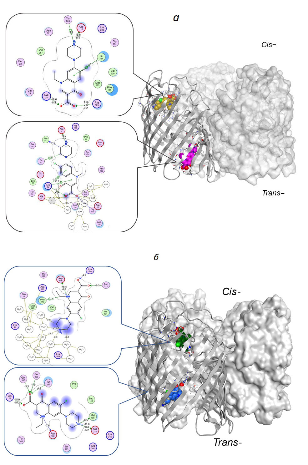 Рис. 5. Пространственная организация вероятных комплексов YpOmpF с Nf·HCl. 3D-структура гомотримера порина YpOmpF, две субъединицы представлены в виде молекулярной поверхности, одна — в виде ленточной диаграммы, липиды и водное окружение удалены для наглядности. Молекулы NfH+1 (а) и Nf2H+2 (б) в двух сайтах связывания приведены в шаровом представлении, в trans-положении розовым и синим цветом, в cis-положении — желтым и зеленым цветом, соответственно окружающие их аминокислотные остатки приведены в стержневом представлении. В выносках приведены 2D-диаграммы межмолекулярных взаимодействий NfH+1 (а) и Nf2H+2 (б) в обоих сайтах связывания.