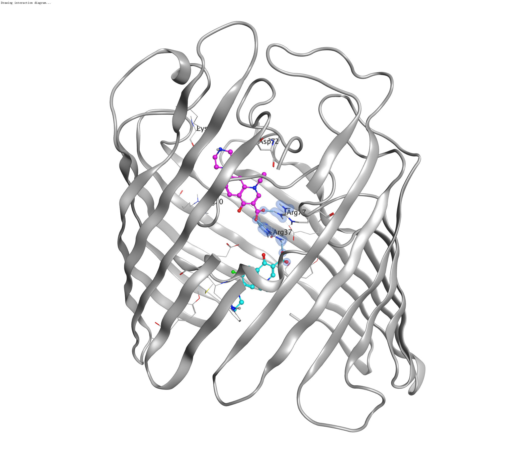 Рис. 7. Пространственная организация вероятных комплексов Nf с YpOmpF. 3D-структура мономера порина YpOmpF, в виде ленточной диаграммы, часть β-тяжей, липиды и водное окружение удалены для наглядности. Возможные ориентации молекулы Nf (верхняя часть — розовый цвет и нижняя часть — голубой цвет) в ЗК приведены в шаростержневом представлении, остатки, ответственные за связывание Nf, приведены в стержневом представлении и обозначены. Ионные взаимодействия обозначены голубыми поверхностями, водородные связи — серыми стержнями.