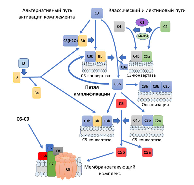 Функция С3b в протеолитическом каскаде реакций активации комплемента заключается в расщеплении (конвертации) фактора С5. При классическом и лектиновом путях С5-конвертаза представляет собой комплекс C4b2a3b. При альтернативном пути C3b взаимодействует с фактором B с образованием сначала C3-конвертазы (C3bBb) и запуском петли амплификации альтернативного пути, т. е. расщепления С3 до С3a и C3b. Далее новообразованный С3b и C3bBb объединяются в комплекс C3bBbC3b. Он уже начинает работать как С5-конвертаза, расщепляющая неактивный фактор С5 до анафилактического пептида С5а и белка C5b. Как уже отмечено выше, к C5b на мембране последовательно присоединяются факторы С6, С7, С8 и С9. В итоге формируется мембраноатакующий комплекс (МАК) C5b-9 — крупная пора, нарушающая целостность мембраны бактерий [2].