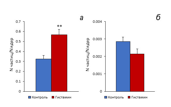 Рис. 4. Влияние гистамина на присоединение фактора C3/С3b к HUVEC. Клетки инкубировали с разведенной в 3 раза в ФСР плазмой крови (а) или в ФСР без плазмы (б). Показано среднее количество участков отложения C3/С3b в пересчете на одну клетку без инкубации с гистамином или после предварительной активации HUVEC гистамином. Приведены результаты 6 независимых измерений (**p < 0.01).