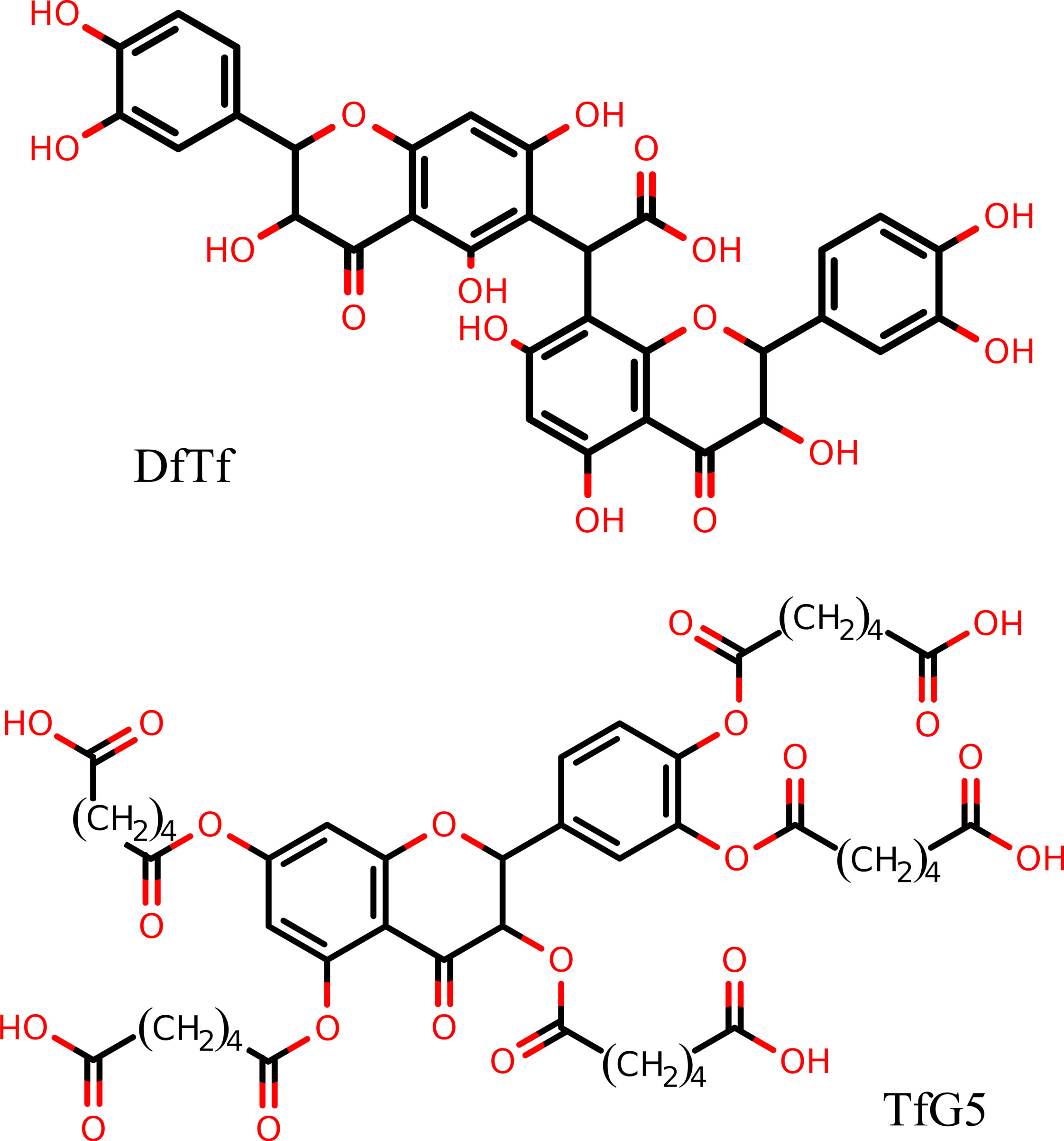 Рис. 1. Полифенолы, используемые для стабилизации коллагена. DfTf — конъюгат таксифолина с глиоксалевой кислотой, TfG5 — пентаглутарат таксифолина.