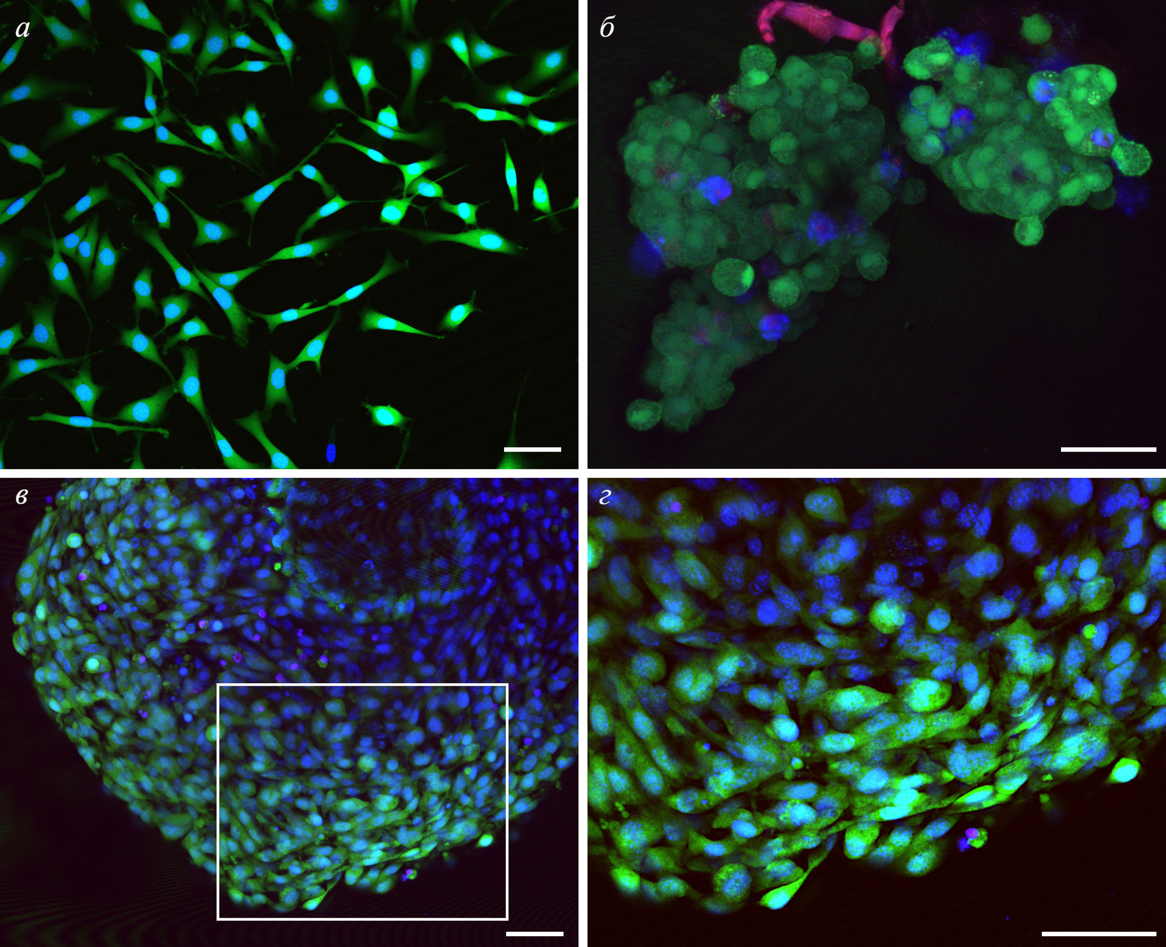 Рис. 4. Фибробласты NIH 3T3 на поверхности гелевых материалов после инкубации в течение 24 ч. а — Контроль. Клетки высевали на поверхность коллагеновой матрицы, не содержащей полифенол. В процессе инкубации коллагеновая матрица деградировала, и фибробласты прикрепились к поверхности чашки. б–г — Клетки на поверхности гелевого материала, содержащего 2.5% DfTf (б), 2.5% TfG5 (в), 2.5% TfG5 при большем увеличении (г). Ядра клеток окрашены Hoechst 33342 (синий канал) и пропидий иодидом (красный канал) для выявления мертвых клеток. Цитоплазма живых клеток окрашена кальцеином-AM (зеленый канал). Масштабный отрезок 50 мкм.
